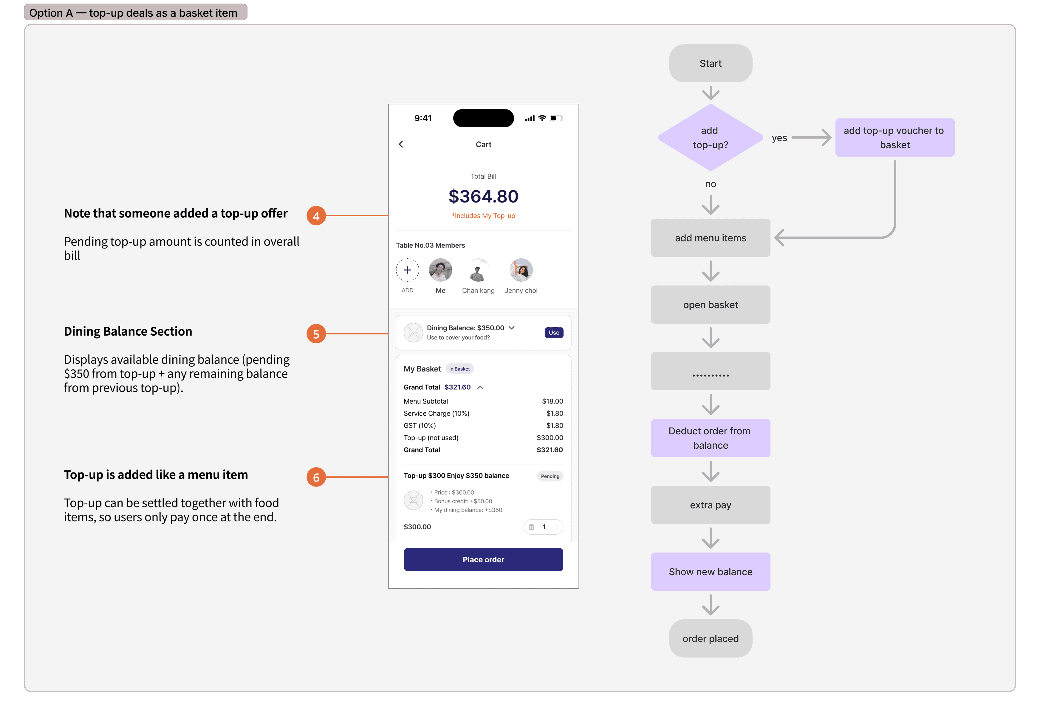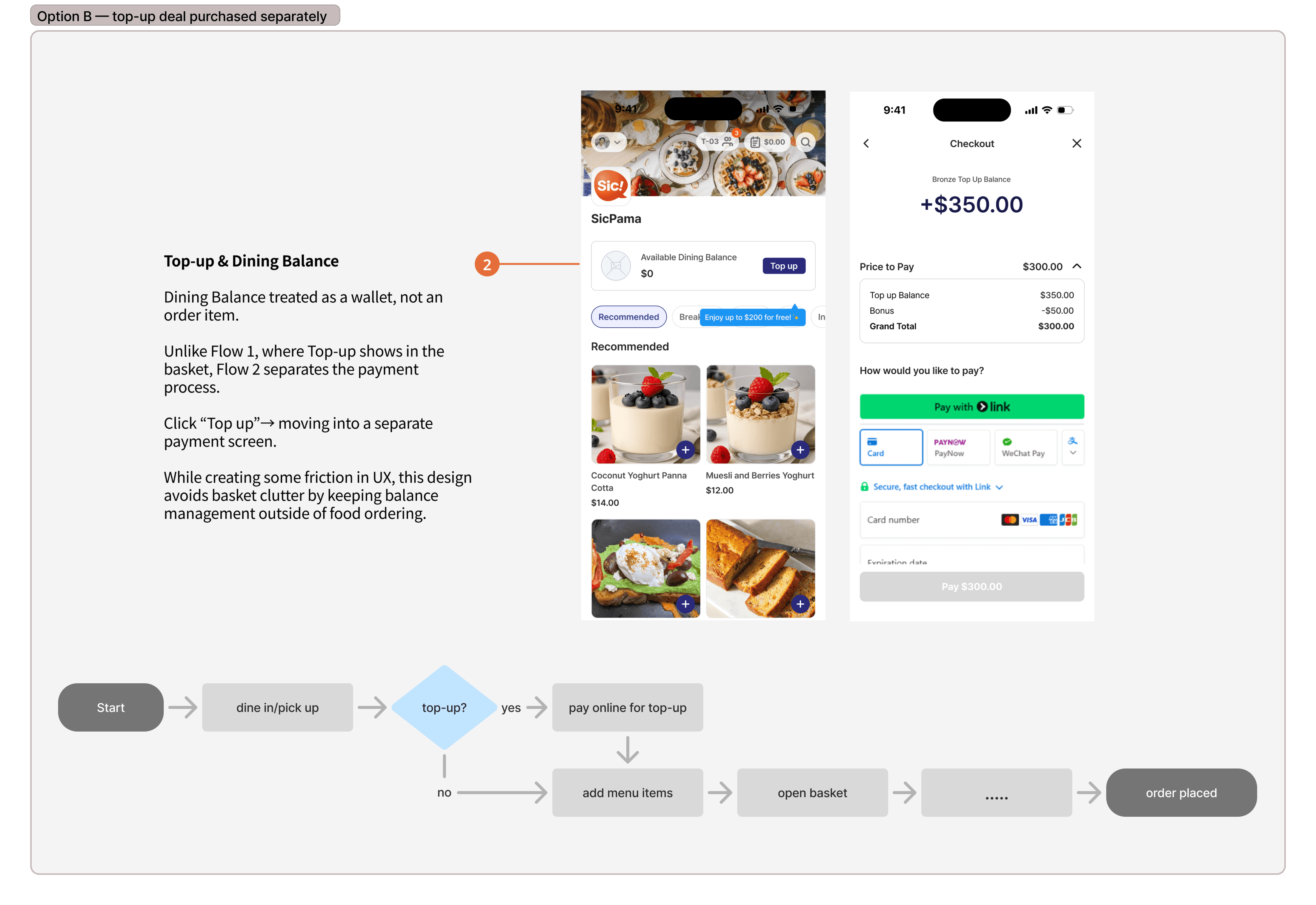 Once the scope was set, I proposed multiple top-up purchase flows that needed a deliberate call. Here are the main options: