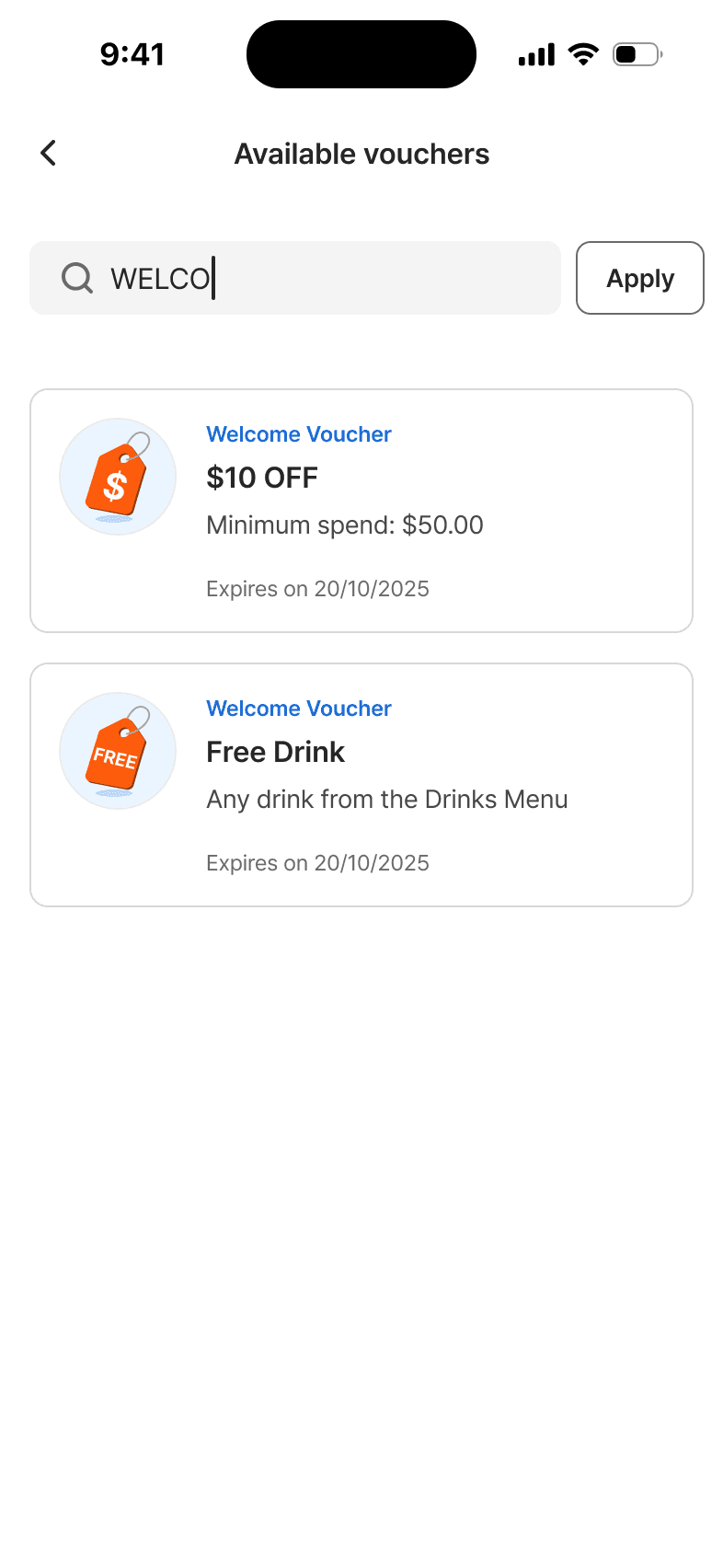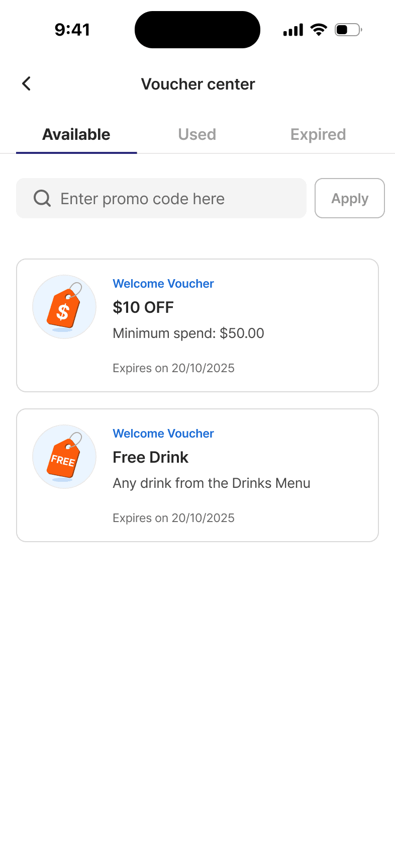 Welcome and birthday vouchers with rules like expiration, min-spend, category restrictions