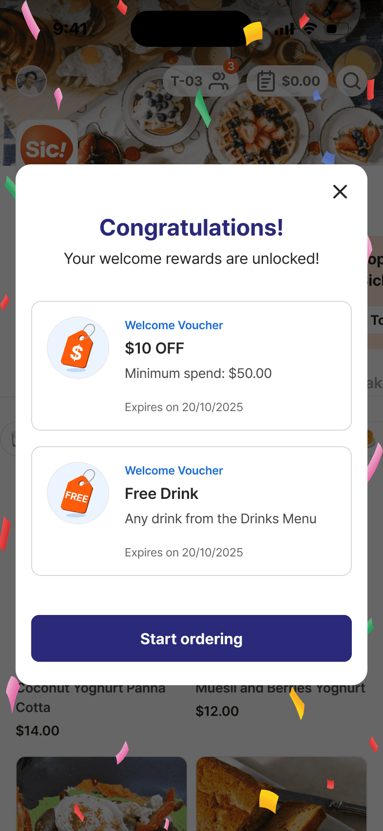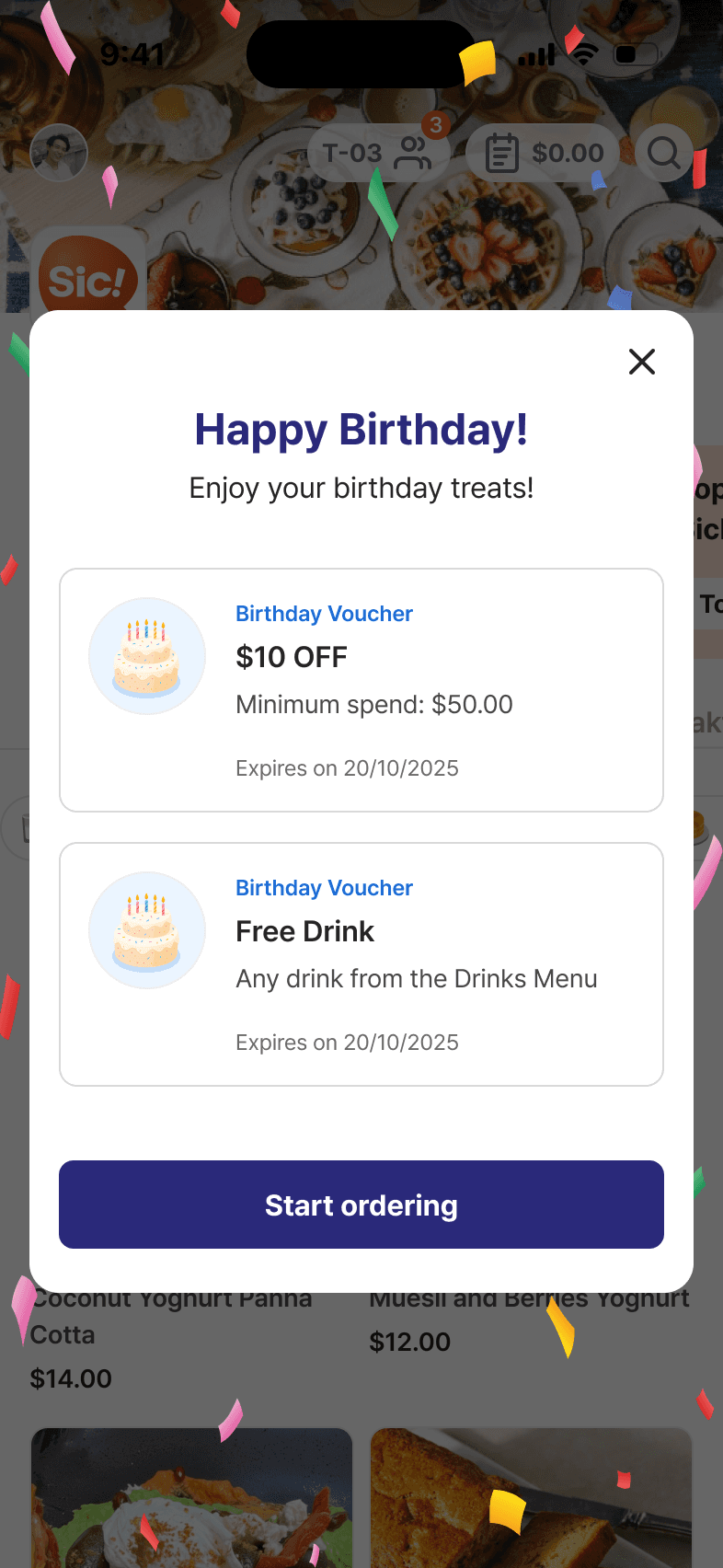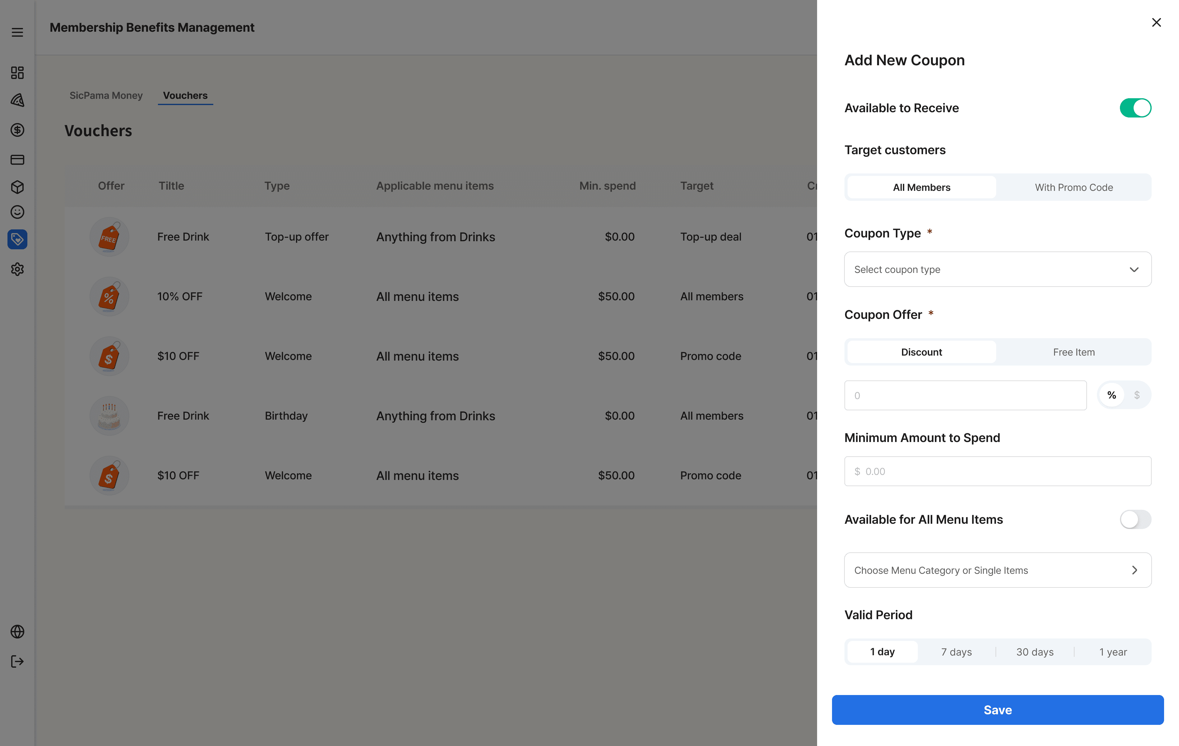 Create welcome & birthday offers with rules (expiration/min-spend/menu restrictions) + table view