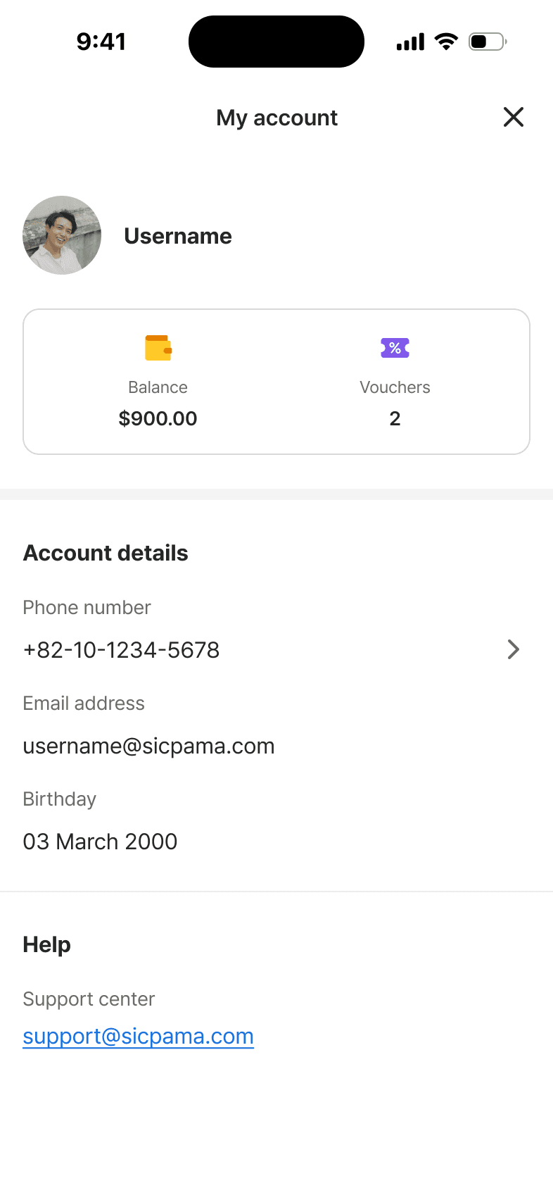 My account (balance, vouchers, transaction history)