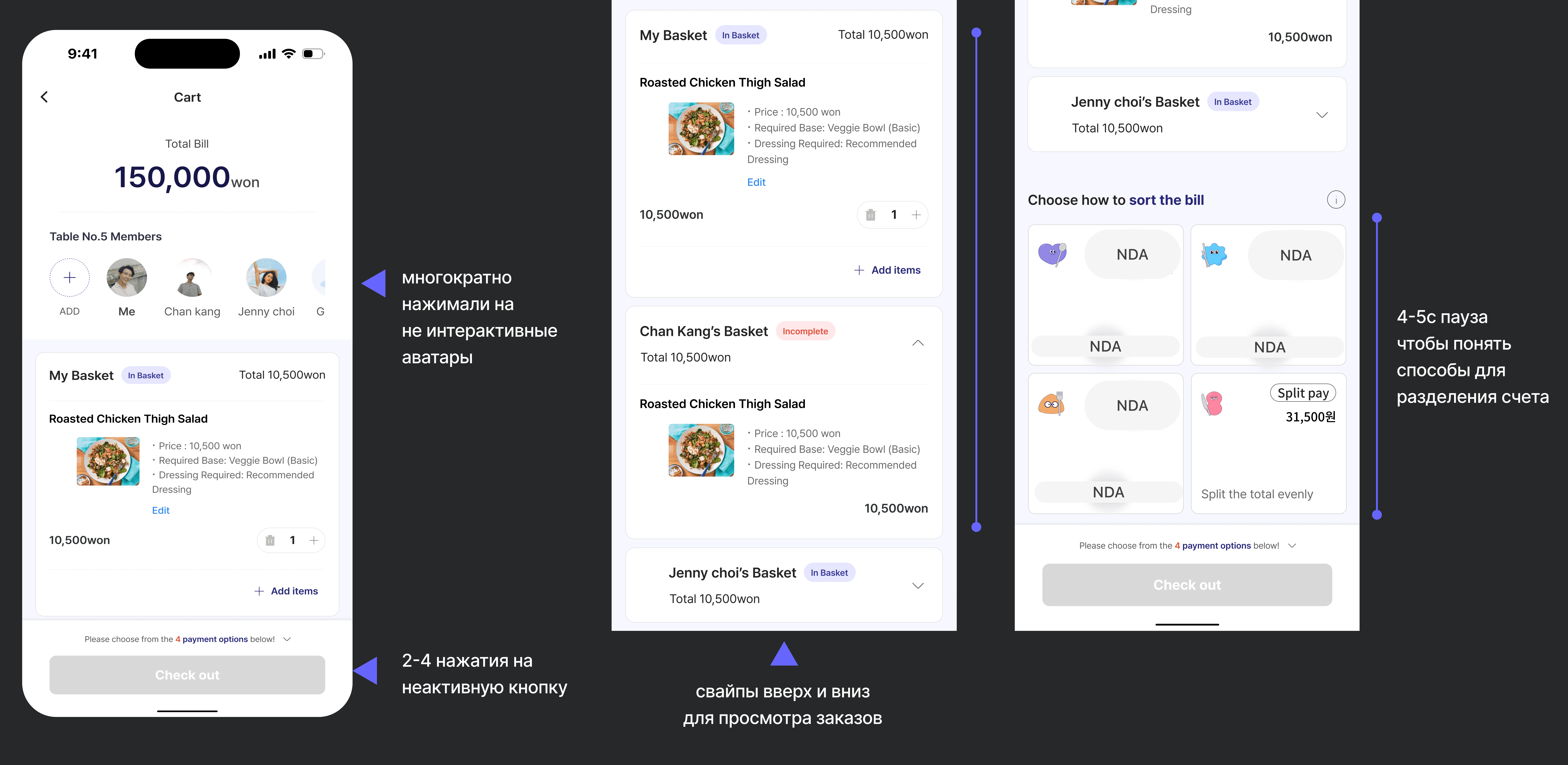 Изначальный флоу был спроектирован для максимально быстрого оформления и оплаты заказов в ресторанах группой пользователей за одним столом.